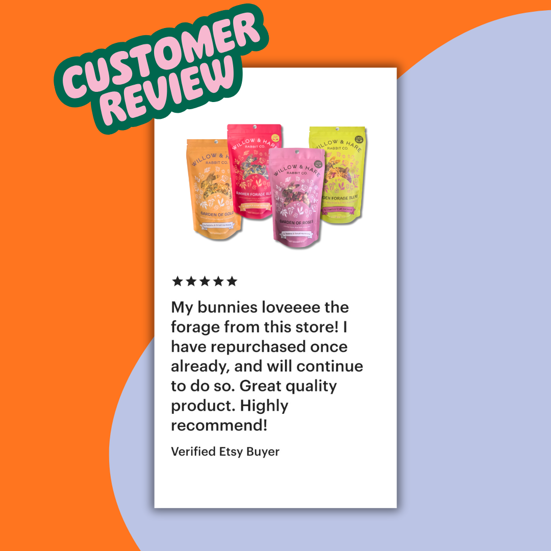 Treat your bunny to a sunny seasonal mix with our Summer Forage Blend! This vibrant herbal mix features blue cornflower, hibiscus, chamomile, rose petals, calendula, and dandelion leaf. Perfect for daily foraging fun, this blend supports natural grazing behavior, promotes healthy digestion, and adds a colorful boost to your rabbit’s enrichment routine.